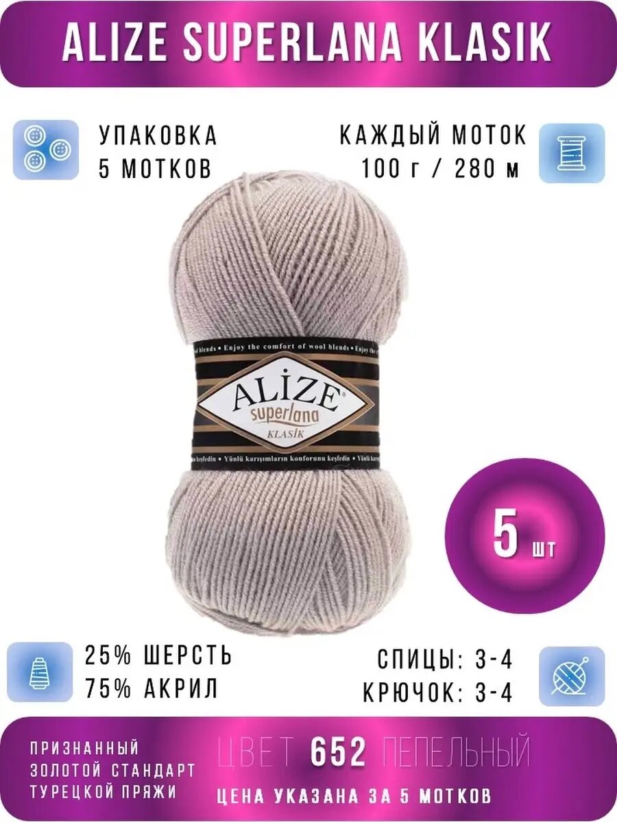 Пряжа ALIZE SUPERLANA KLASIK, пепельно-сиреневый - 505, 25% шерсть, 75% акрил, 5 мотков, 100 г, 280 м.