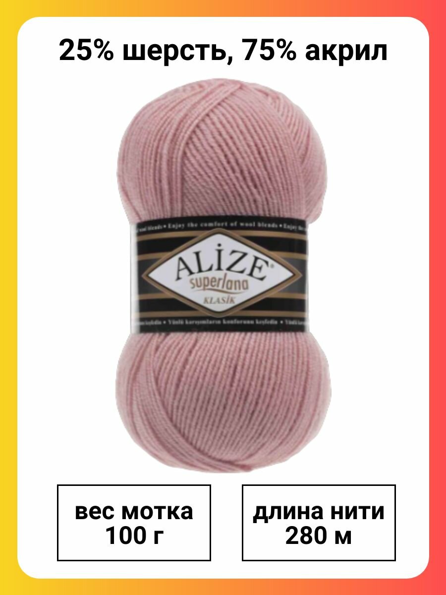 Пряжа Alize Superlana klasik (Суперлана Классик) - 1 моток 363 нежная роза 25% шерсть, 75% акрил 280м/100г