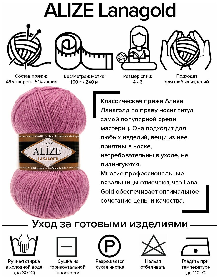 Пряжа Alize Lanagold темно-розовый (178), 51%акрил/49%шерсть, 240м, 100г, 2шт