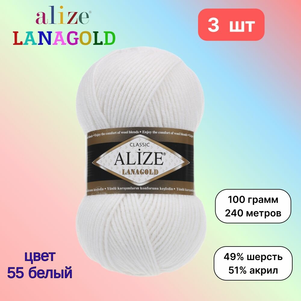 Купить Пряжа для вязания Alize Lanagold (Ализе ланаголд) 3 мотка, Цвет: Белый (55), 49% шерсть 51% акрил, 100 г 240 м