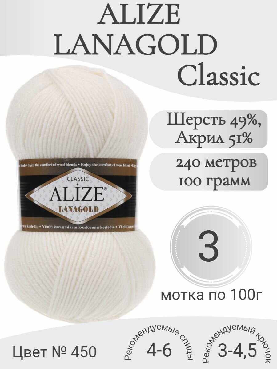 СохранитьПряжа Alize Lanagold Жемчуг (450) 3 мотка 100 г/240 м (49% шерсть, 51% акрил) ализе ланаголд интересное: