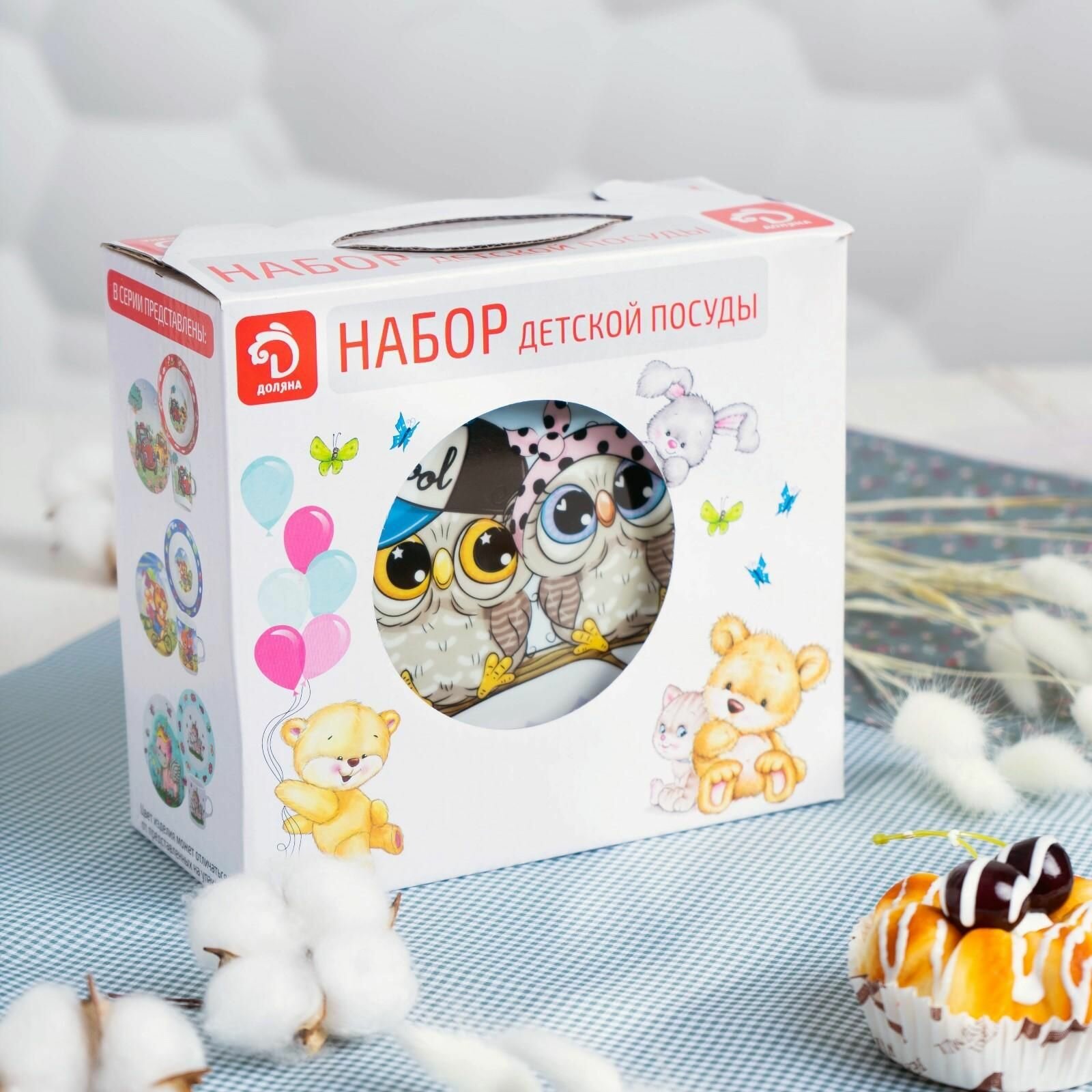 Набор детской посуды Доляна «Совы тинейджеры», 3 предмета: кружка 230 мл, миска 400 мл, тарелка 18 см