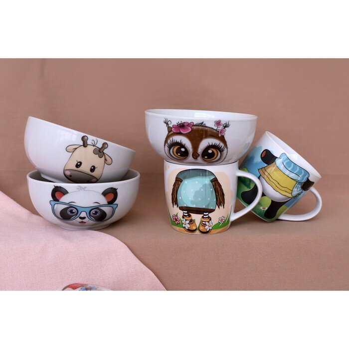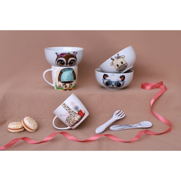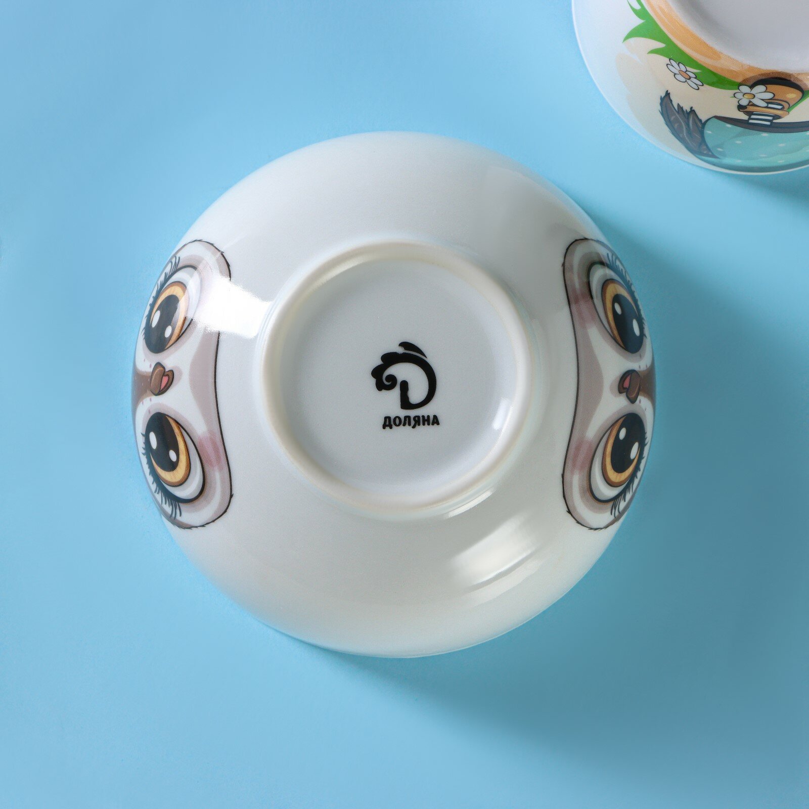 Набор детской посуды из керамики Доляна «Совенок», 2 предмета: кружка 230 мл, миска 400 мл, цвет белый