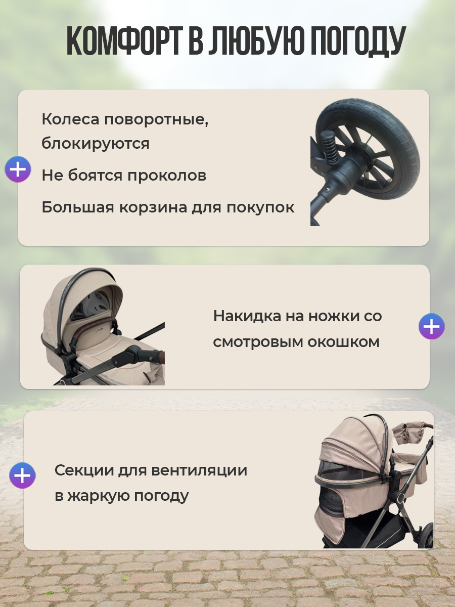 | Аксессуары в комплекте | адаптеры для крепления автокресла, антимоскитная сетка, бампер, дождевик, матрас, муфта для рук, солнцезащитный козырек, сумка |
