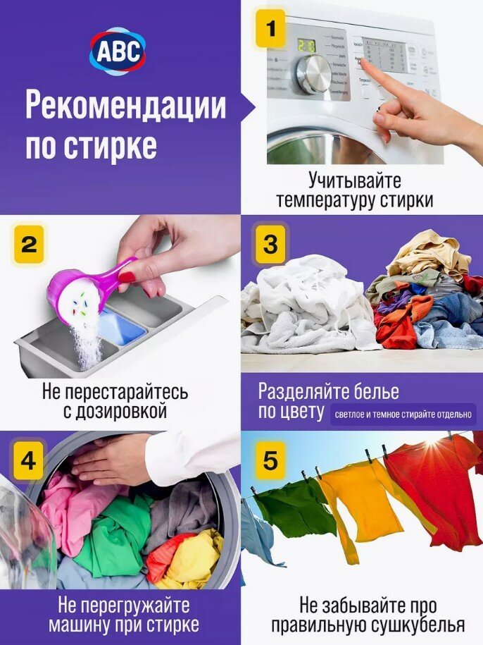 | Способ применения | Стиральный порошок АВС предназначен для стирки белого белья , удаляет стойкие загрязнения, аромат свежести , защита волокон |
