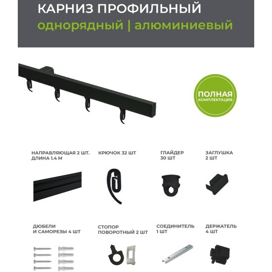 | Комплектация | Направляющая раздвижная - 1 шт, наконечники - 2 шт, держатели - 3 шт, кольца с крючками - 25 шт, шурупы с дюбелями - 6 шт. |