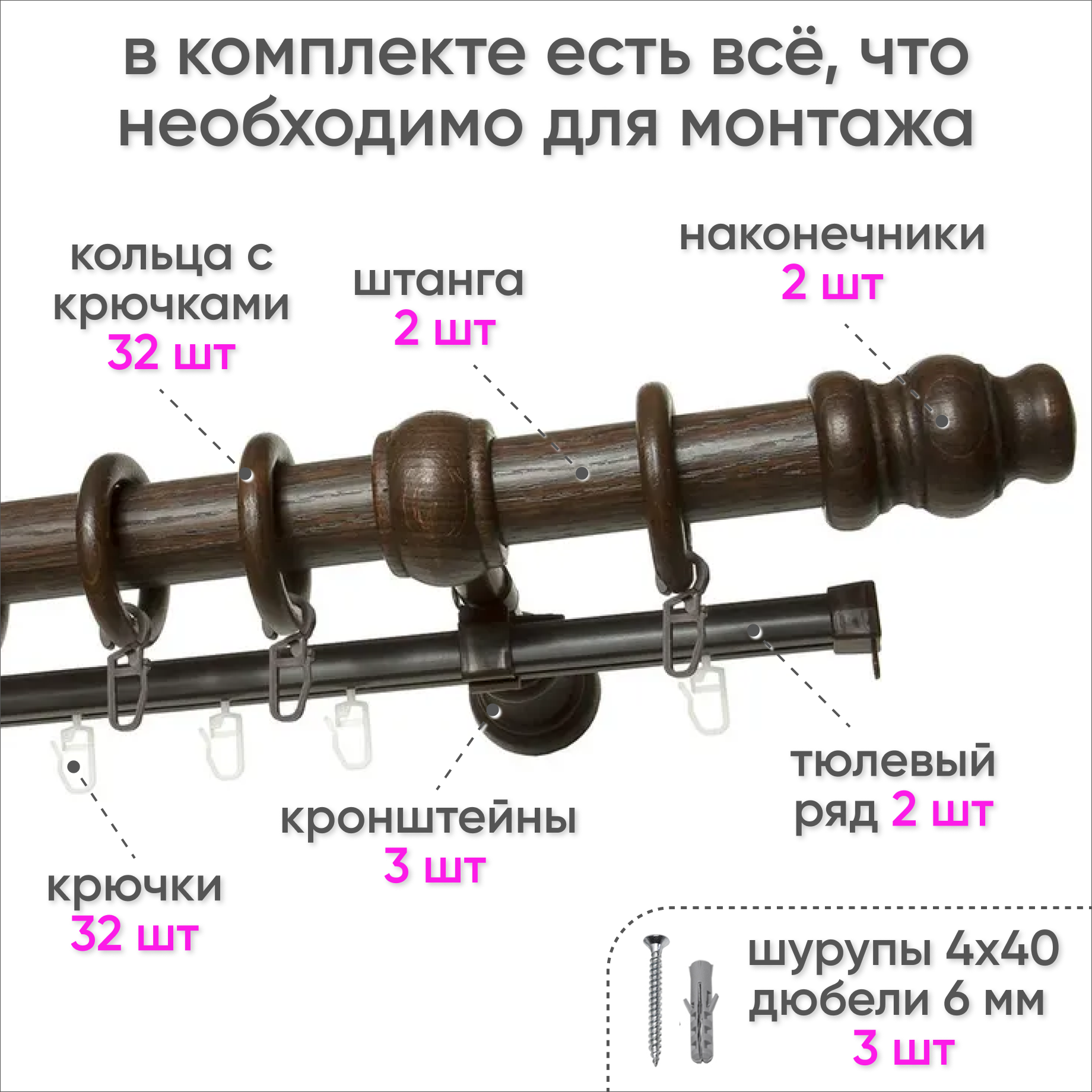Карниз для штор и гардин двухрядный настенный деревянный, цвет каштан, 300 см