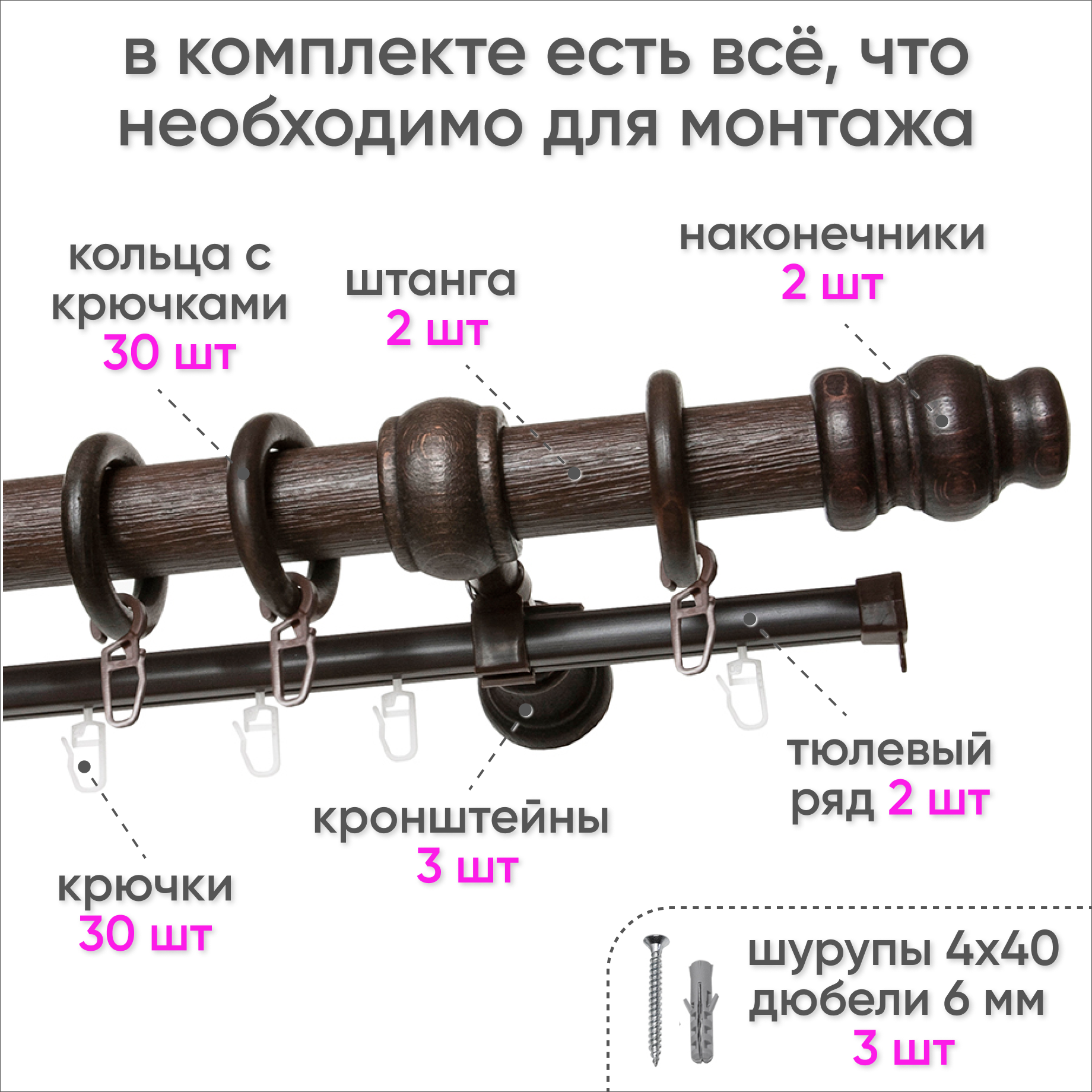 | Комплектация | Штанга, кронштейны, кольца, крючки, наконечники, вторая направляющая, заглушки, комплект креплений, инструкция |