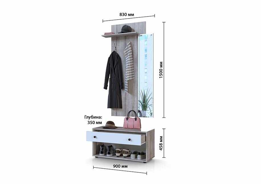 Комплект прихожей, мебель в прихожую с зеркалом, тумбой и ящиком "Граф-3", 900х270х2020