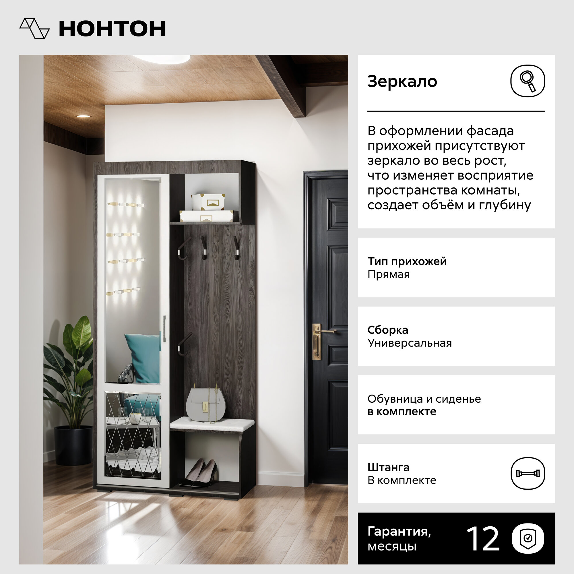 | Особенности | для маленькой прихожей, для узкой прихожей, мягкое сиденье, с местом для сидения, со штангой для вешалок, шкаф с зеркалом |