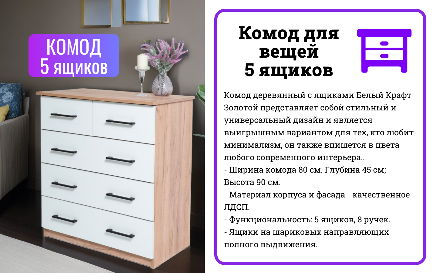 Ниже Вы можете прочитать отзывы на Комод с 5-ю ящиками, 80х45х90, цвет Крафт золотой/белый на шариковых направляющих, ознакомится с подробными характеристиками, посмотреть интересные обзоры и фотографии на Комод с 5-ю ящиками, 80х45х90, цвет Крафт золотой/белый на шариковых направляющих.
