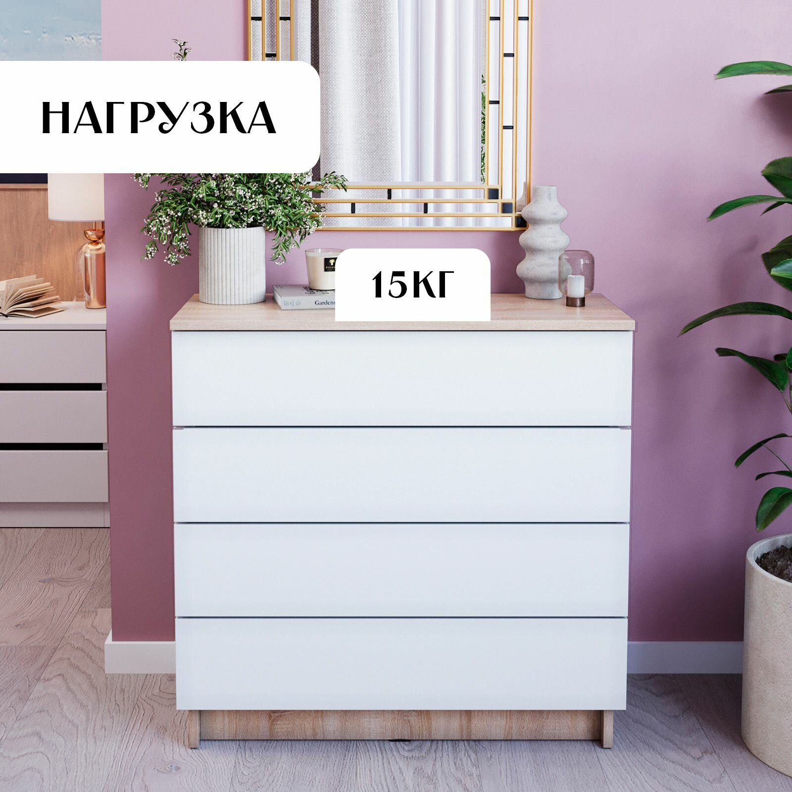 Комод для одежды с 4 ящиками, с ручками, большой Мальта Plus Белый деревянный