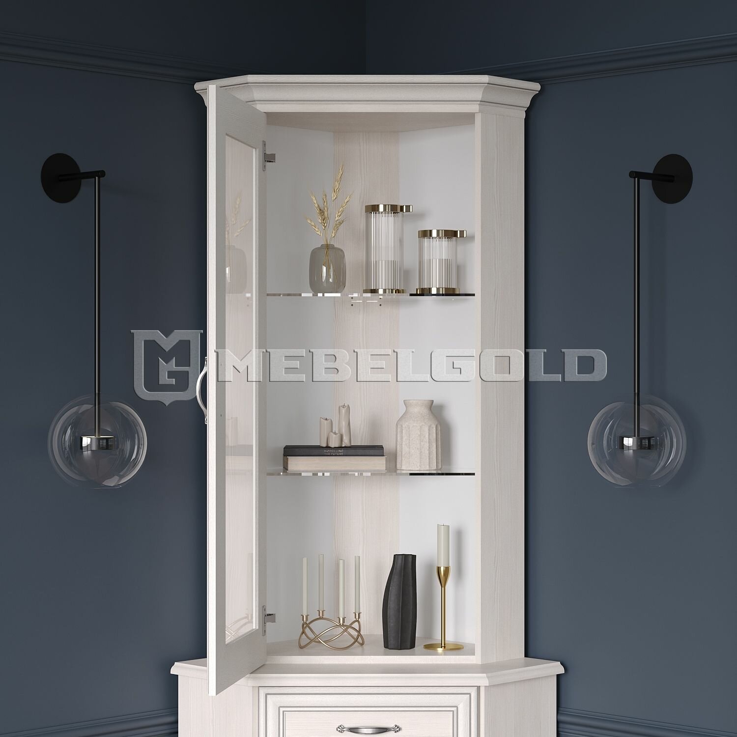 | Комплектация | Шкаф с витриной Монако 1VU – угловой (U). Имеет одно отделение с полками из закалённого стекла за витриной (1V) для хранения предметов декора, посуды, памятных предметов. |