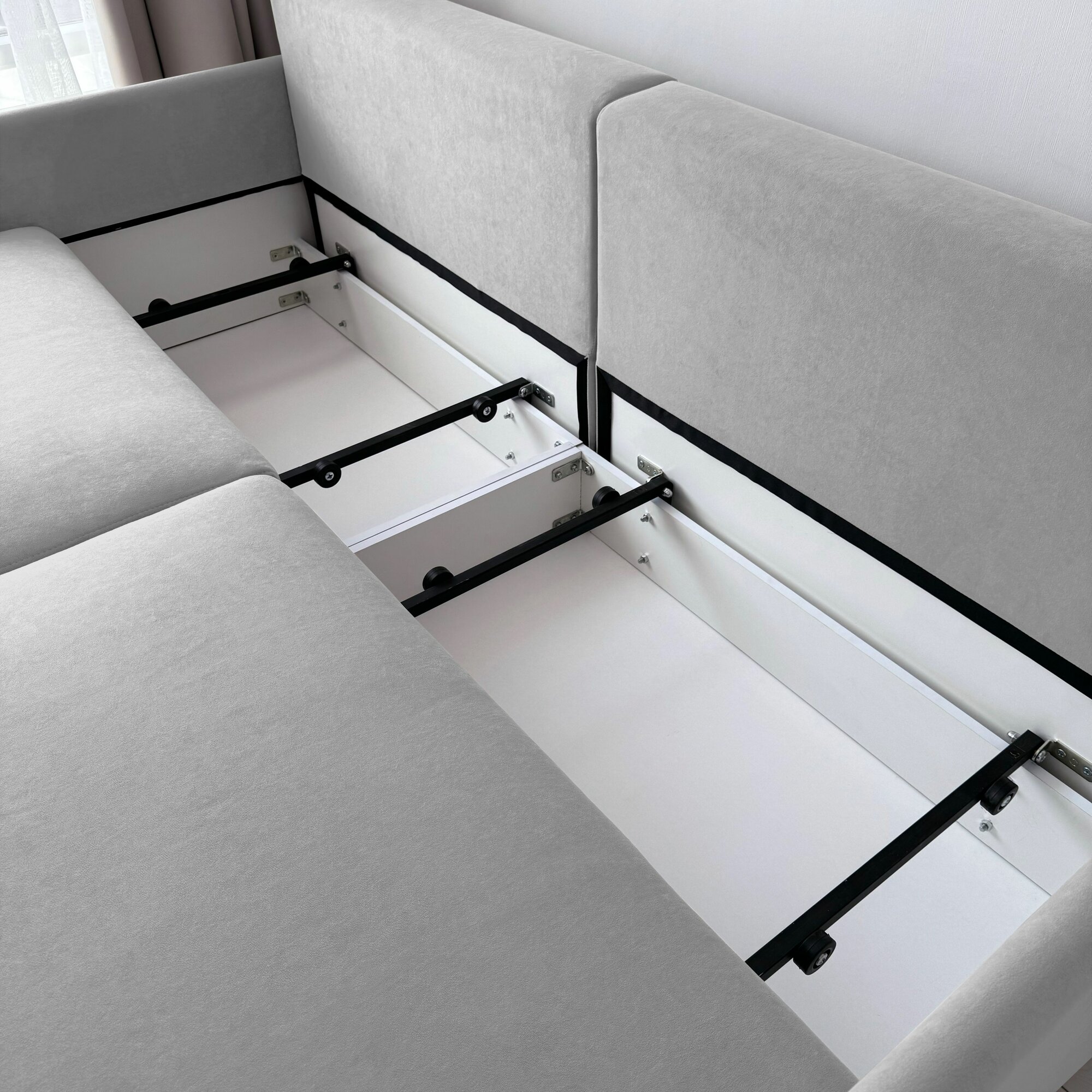 | Особенности | модульный, пружинный блок, раскладная конструкция, с подлокотниками, съемный чехол, ящик для белья |