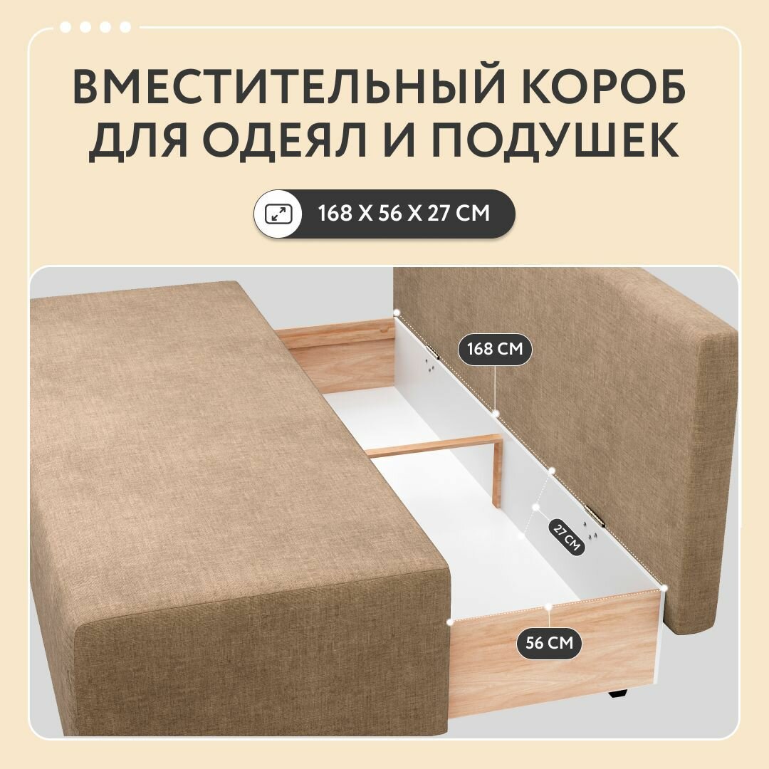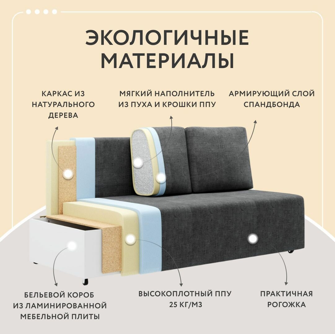 | Особенности | раскладная конструкция, съемные подушки, ящик для белья |