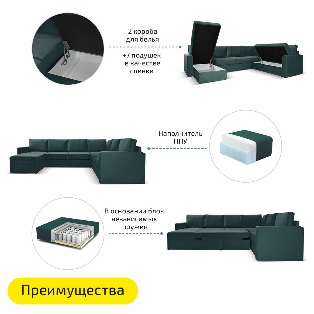 Диван кровать угловой AH!DIVAN (АхДиван)304х235х85см, раскладной П-образный Кольдинг, механизм дельфин, темно-зеленый велюр