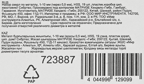 | Количество сверл по металлу | 19 шт. |