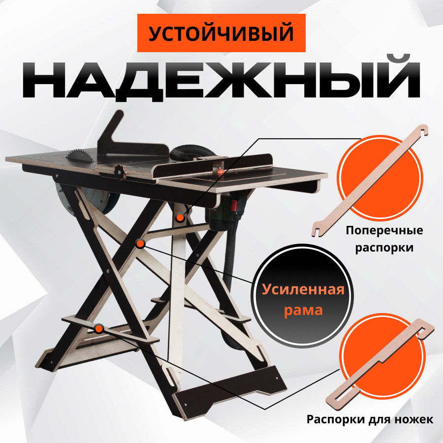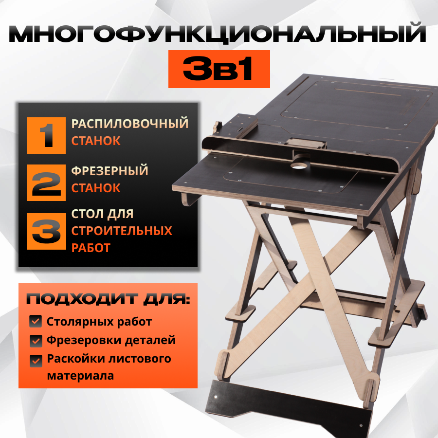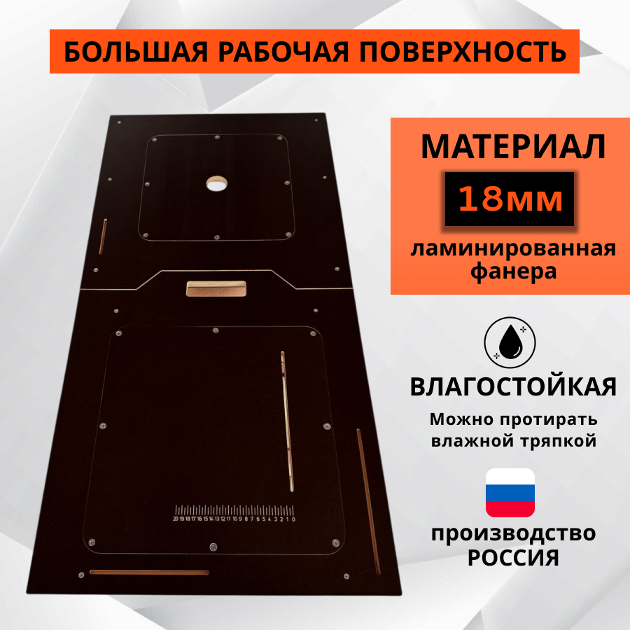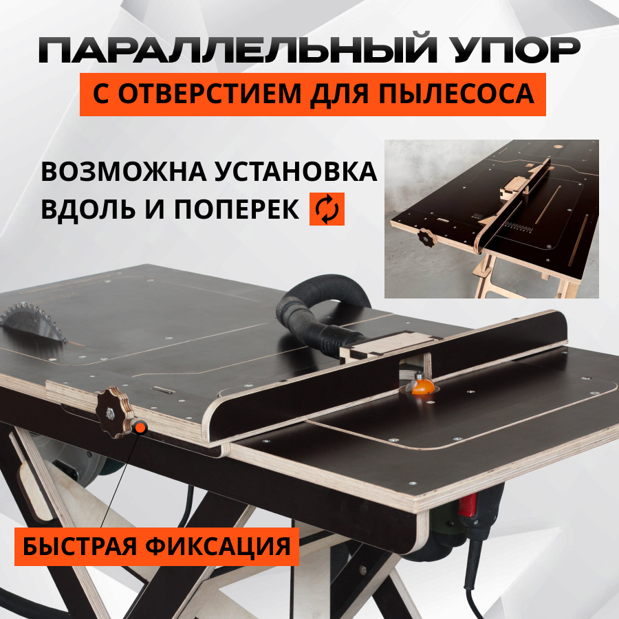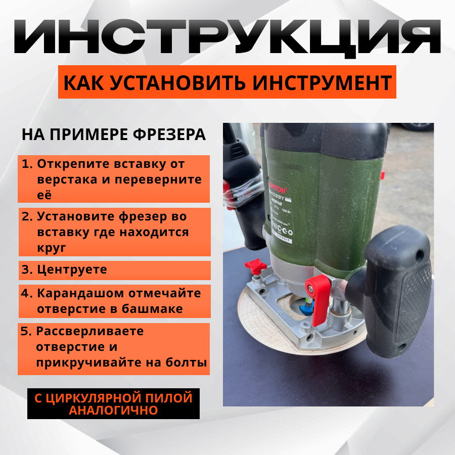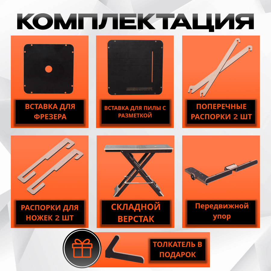 | Подробная комплектация | Рабочий стол; Комплект деталей для фиксации конструкцию ( 4 штуки ); Универсальная пластина для крепления фрезера; Универсальная пластина для установки циркулярной пилы; Передвижной упор; Толкатель толкатель для циркулярной пилы, Упаковка (картонная коробка). |