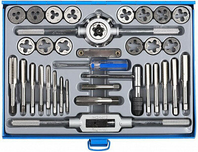 | Подробная комплектация | - 9 метчиков: N3x0.5, M4x0.7, M5x0.8, M6x1.0, M7x1.0, M8x1.25, M9x1.25 M10x1.5, M12x1.75; - 9 сверл под резьбу: 2.5, 3.3, 4.2, 5.0, 6.0, 6.8, 7.8, 8.6, 10.3 мм; - металлический кейс. |