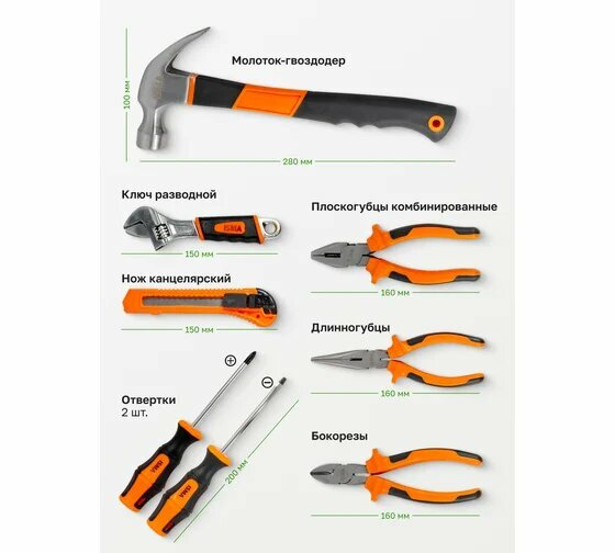 | Ручной инструмент подробно | плоскогубцы, разводной ключ, рулетка, молоток, нож, отвертки, шестигранники, изолента |