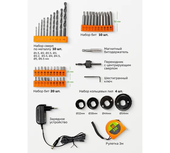 | Аксессуары в комплекте | держатель для бит / дюбели / зенкер / изолента / лезвия для ножа / набор крепежа / нож / ножницы / отвертка индикаторная / рулетка / уровень |