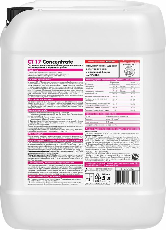 СохранитьГрунтовка-Концентрат Ceresit CT 17 Concentrate 5л (1:10) Глубокого Проникновения для Внутренних и Наружных Работ / Церезит СТ 17. интересное: