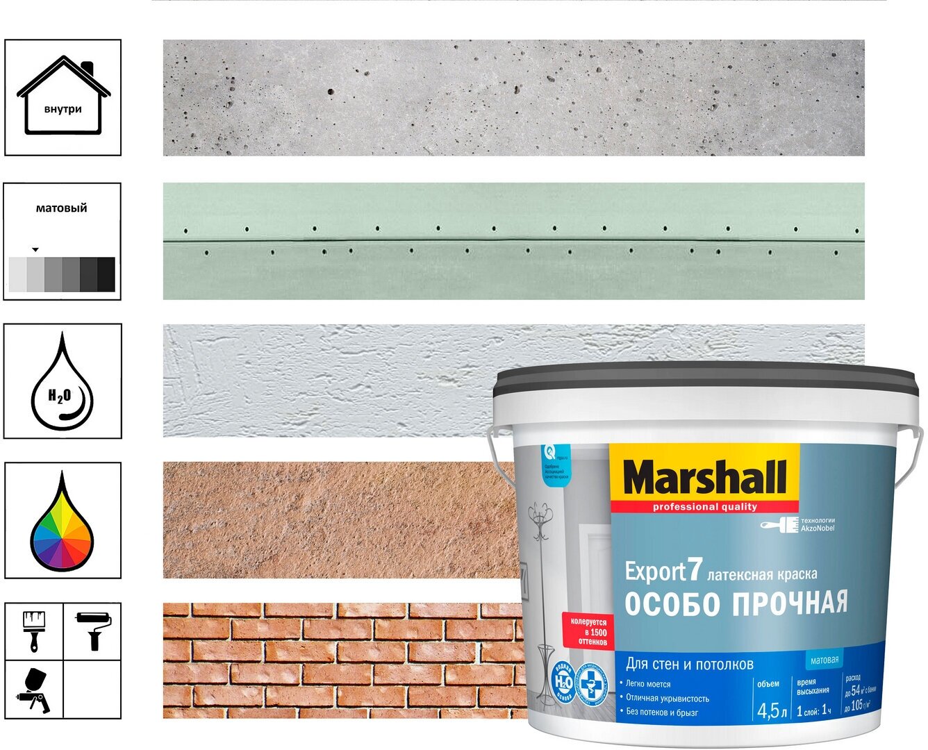 Краска Marshall Export 7 особо прочная, латексная, глубокоматовое покрытие 4.5л