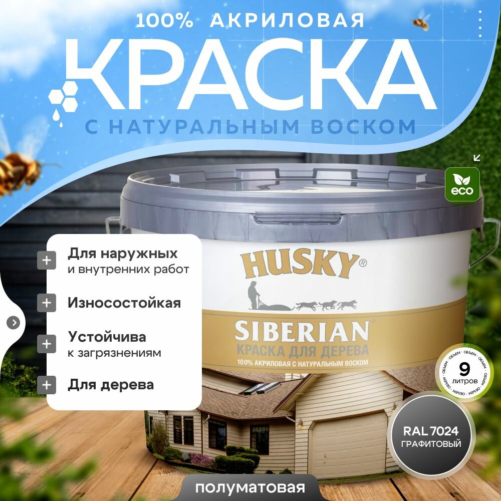 Купить Краска для дерева акриловая полуматовая, HUSKY SIBERIAN 9л Графитовый RAL 7024, с натуральным воском, для наружных и внутренних работ