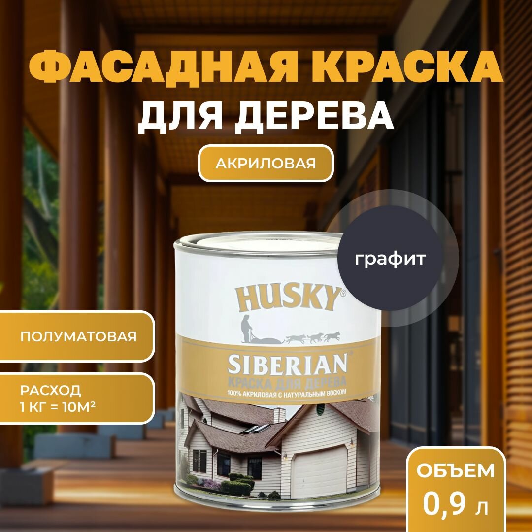 Купить Краска для дерева акриловая полуматовая, HUSKY SIBERIAN 0,9 л Графитовый RAL 7024, с натуральным воском, для наружных и внутренних работ