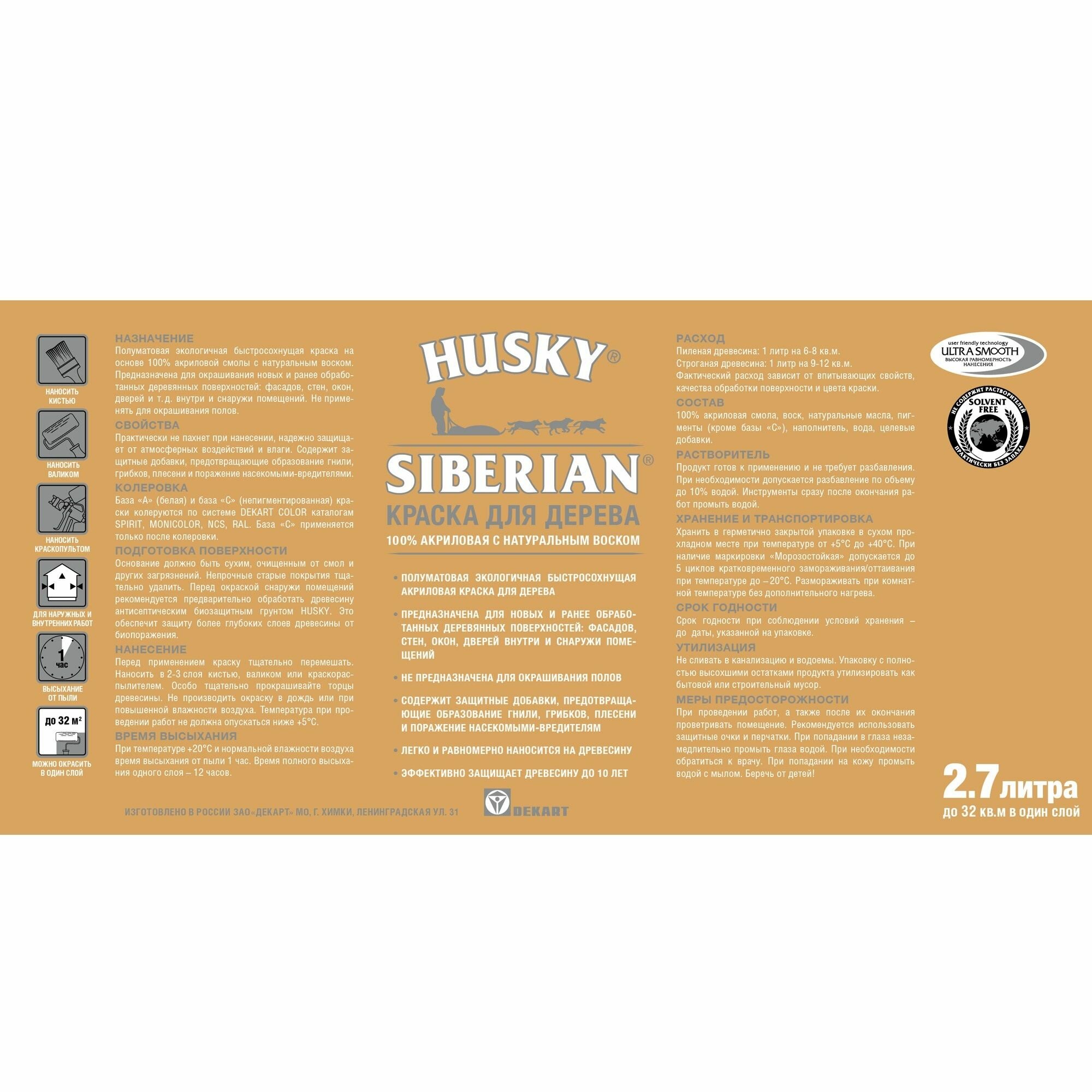 Краска для дерева акриловая полуматовая, HUSKY SIBERIAN 2,7л Белая, база А, с натуральным воском, для наружных и внутренних работ