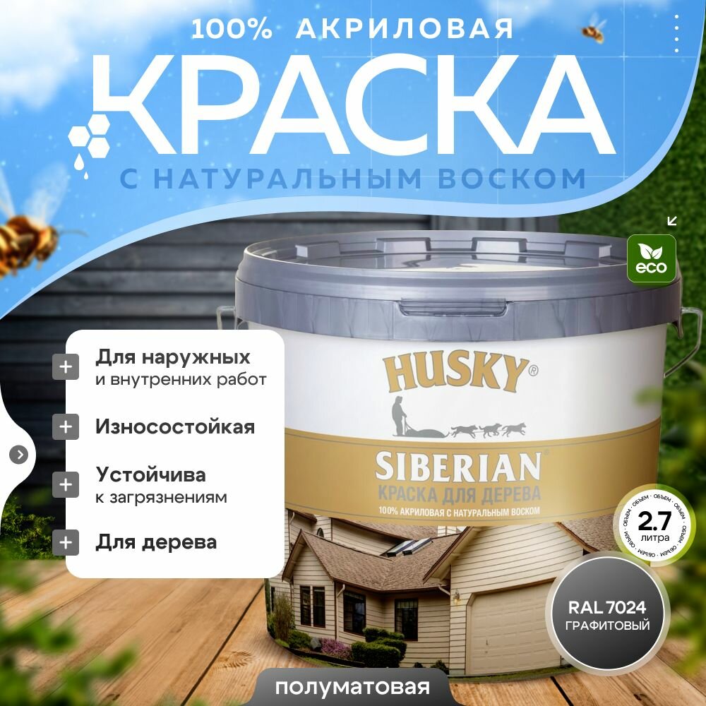 Краска для дерева акриловая полуматовая, HUSKY SIBERIAN 2,7 л Графитовый RAL 7024, с натуральным воском, для наружных и внутренних работ