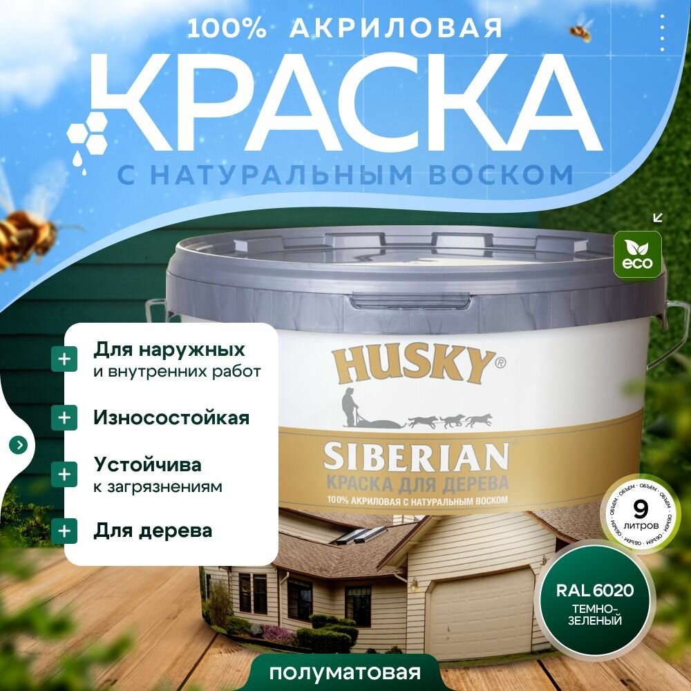 Краска для дерева акриловая полуматовая, HUSKY SIBERIAN 9л Темно-зелёный RAL 6020, с натуральным воском, для наружных и внутренних работ