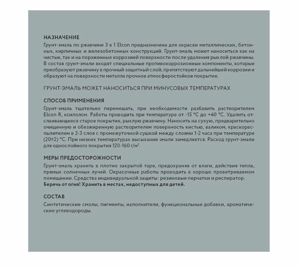 | Дополнительная информация | Грунт-эмаль по ржавчине Elcon 3 в 1 предназначена для нанесения как на чистые, так и на пораженные коррозией металлические поверхности с целью создания надежной антикоррозионной защиты металлоконструкций, оборудования, металлических изделий.Грунт-эмаль можно наносить на прокорродировавшую поверхность после удаления рыхлой ржавчины. Компоненты, входящие в состав грунт-эмали, преобразуют ржавчину в прочный защитный слой, препятствуют дальнейшей коррозии и образуют на поверхности металла прочное атмосферостойкое покрытие.Грунт-эмаль может наноситься при отрицательных температурах до -20 ºС, время сушки «на отлип» при температуре +20 ºС составляет не более 1 часа. |
