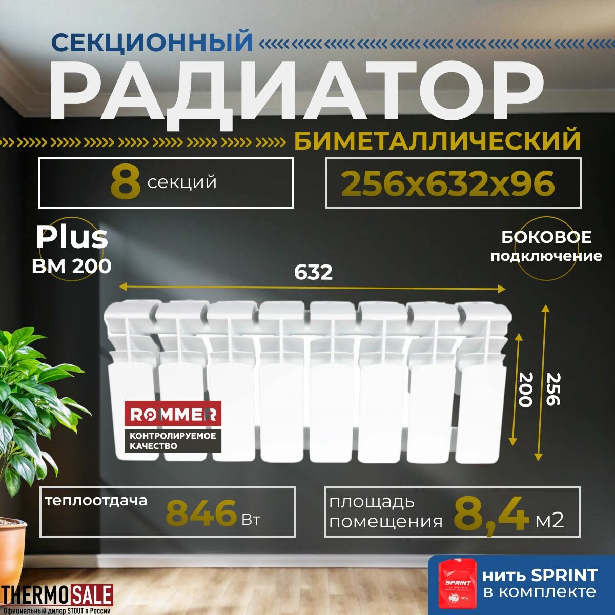 Купить Радиатор отопления секционный биметаллический Plus BM 200 8 секций параметры 256х632х96 боковое подключение (батарея) ROMMER , Сантехническая нить 20 м