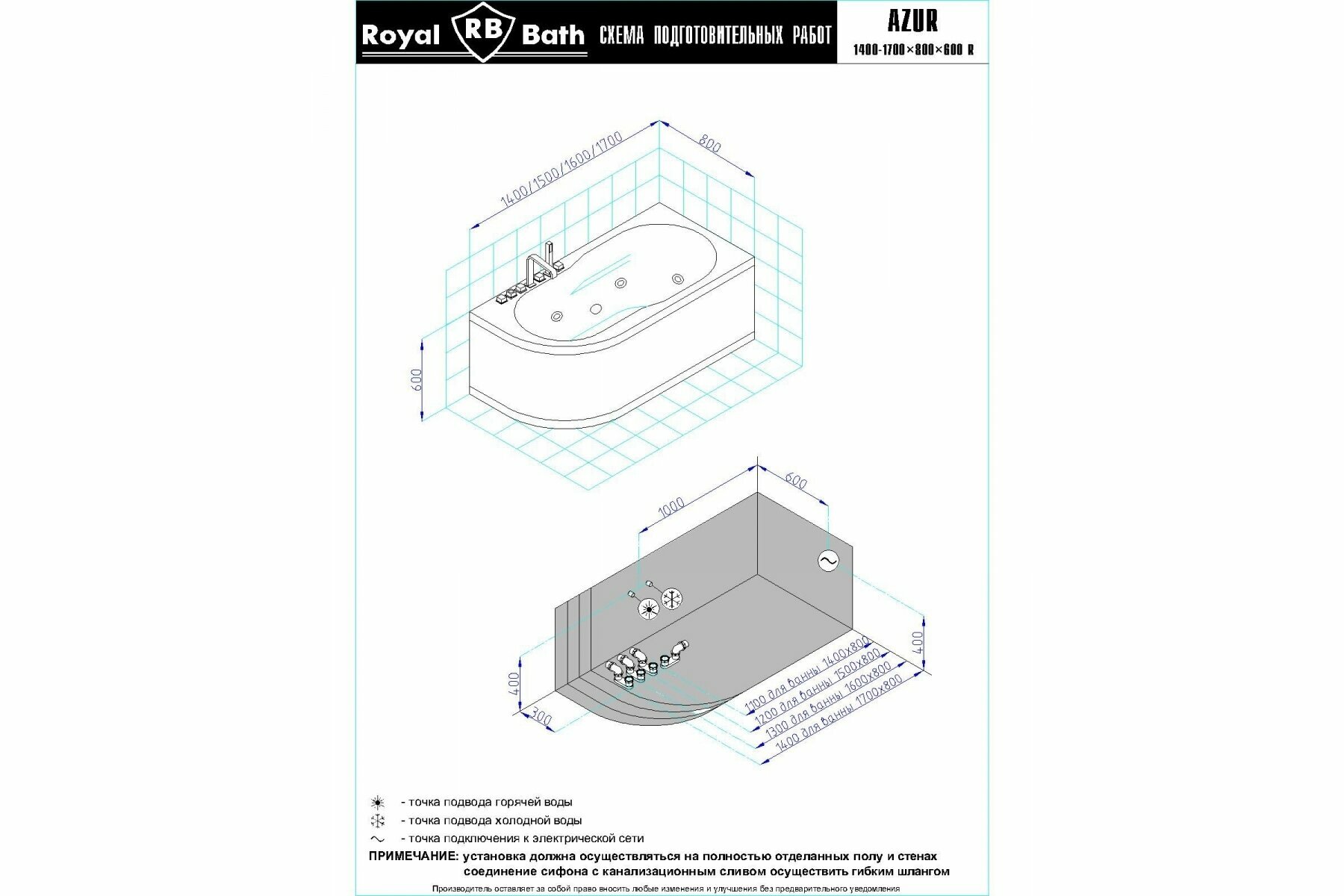 Акриловая ванна Royal Bath AZUR 170X80X60 правосторонняя комплект (ванна, каркас, панель, слив-перелив)