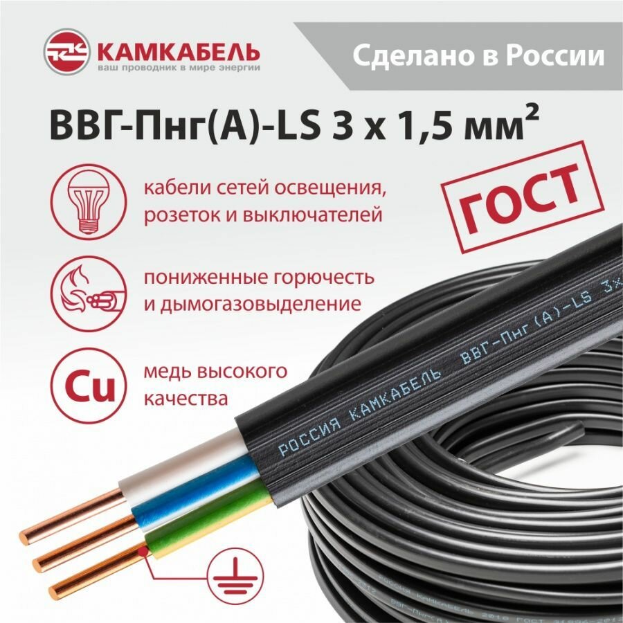 Кабель Камкабель ВВГпнг(A)-LS 3x1.5 мм 50 м ГОСТ цвет черный