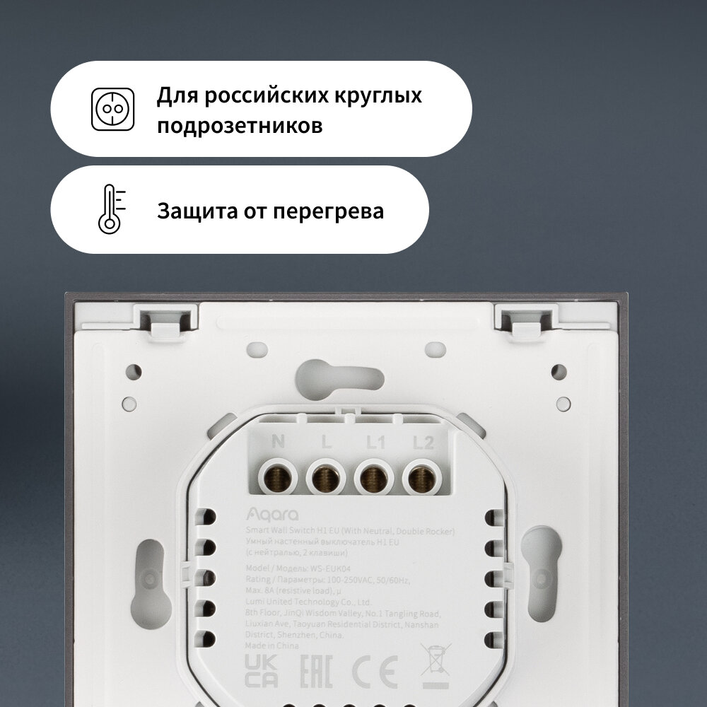 Умный выключатель двухклавишный с нейтралью Aqara H1 WS-EUK04gr, умный дом, серый