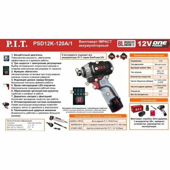 Ударный винтоверт P.I.T. PSD12K-120A/1, 2Ач, с одним аккумулятором