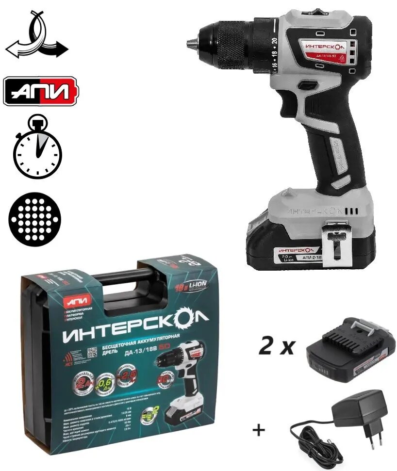 Бесщеточная аккумуляторная дрель-шуруповерт Интерскол ДА-13 / 18В, 50, 2 АКБ, 2 Ач, ЗУ, кейс (776.2.2.70)