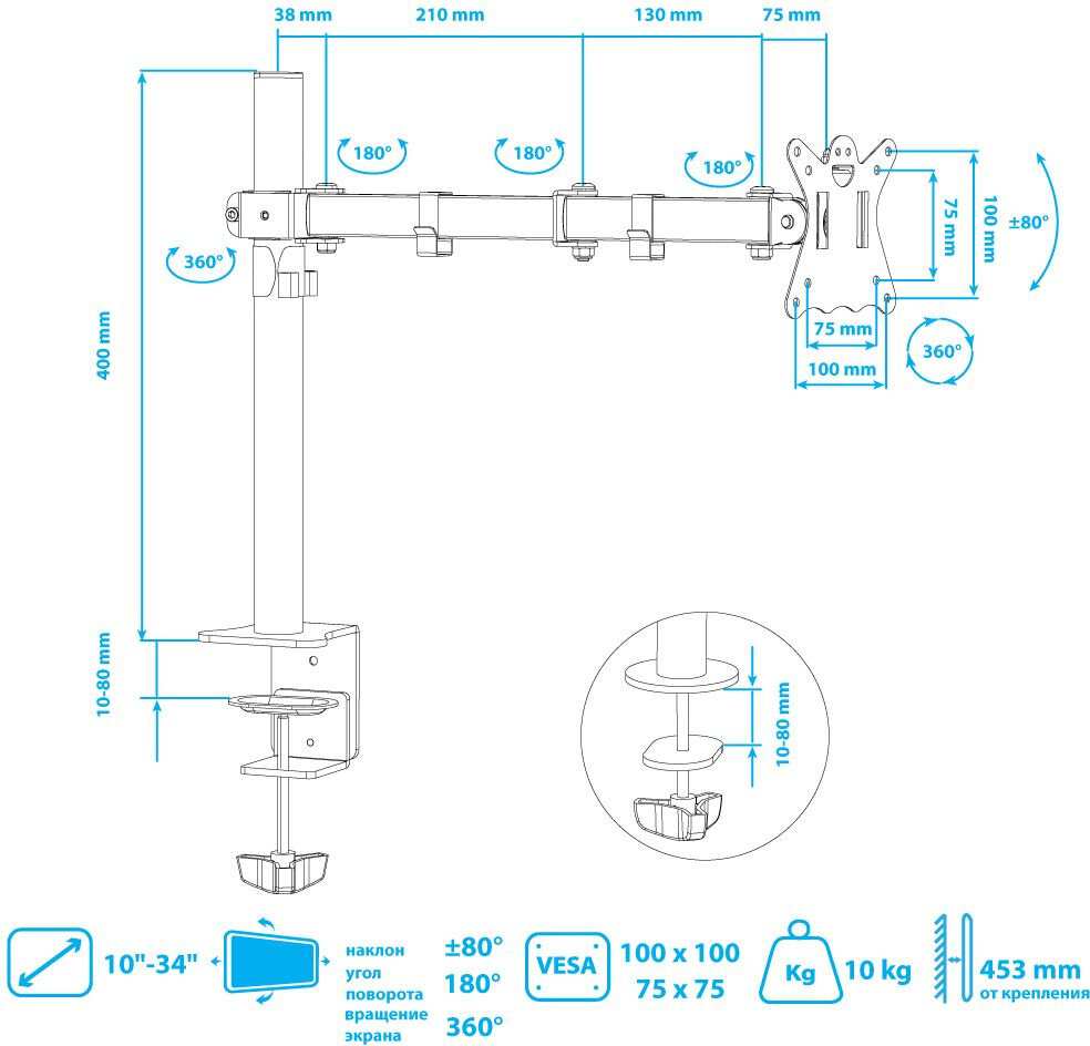 | Комплектация | Настольный кронштейн для монитора, комплект крепежа для установки ТВ, подробная инструкция на русском языке |