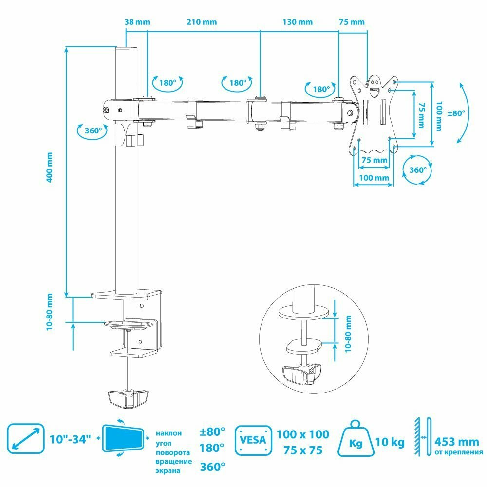 Кронштейн для монитора Kromax Кронштейн для мониторов CASPER-507 черный 10"-34" макс.10кг настольный поворот и наклон 90420