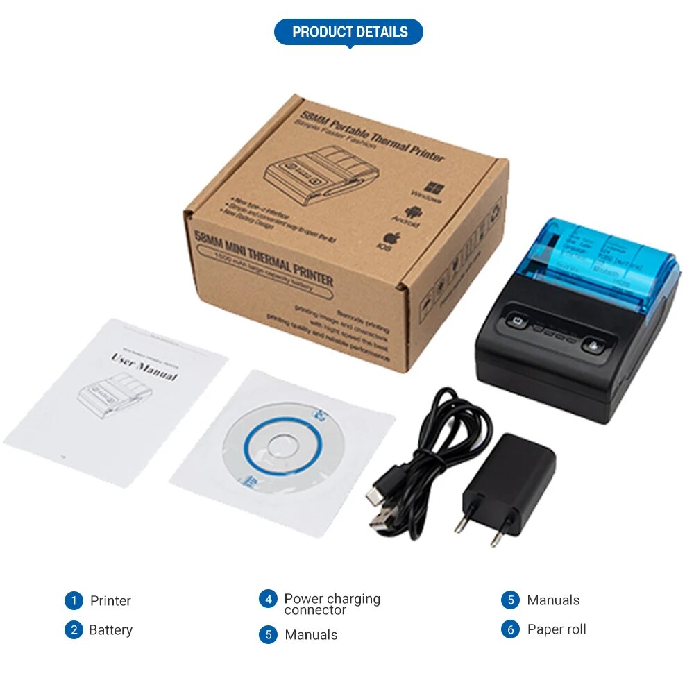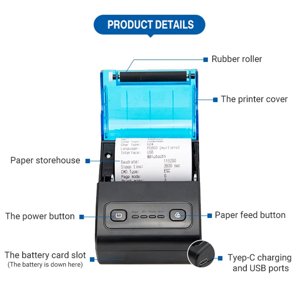 Карманный мини-принтер для чеков, 58 мм, Black Blue, Российская/европейская (EU)