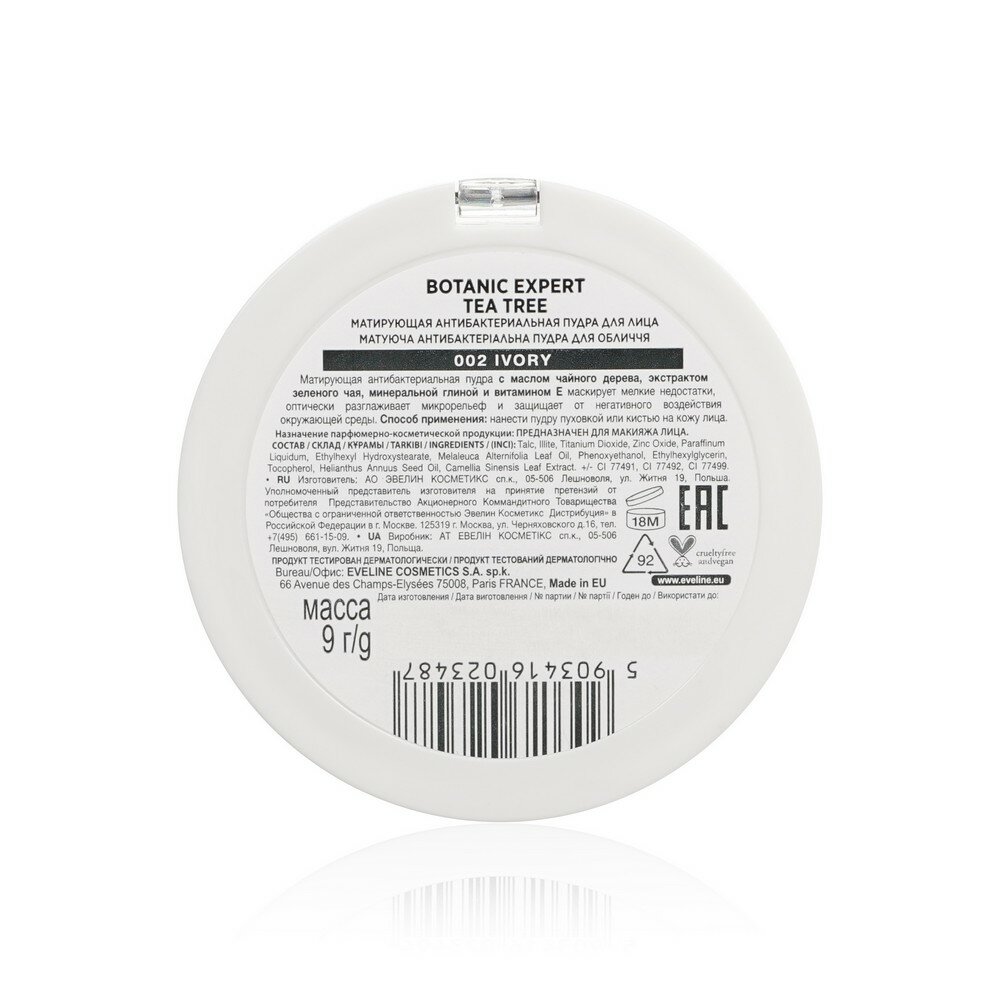 Купить EVELINE Пудра компактная для лица BOTANIC EXPERT 3 в 1 антибактериальная матирующая тон 002 ivory