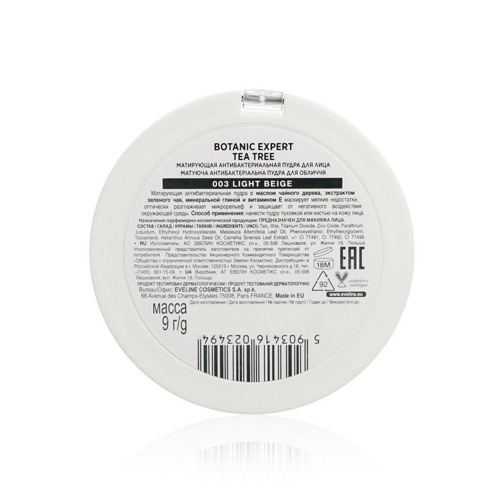 Купить EVELINE Пудра компактная для лица BOTANIC EXPERT 3 в 1 антибактериальная матирующая тон 003 light beige