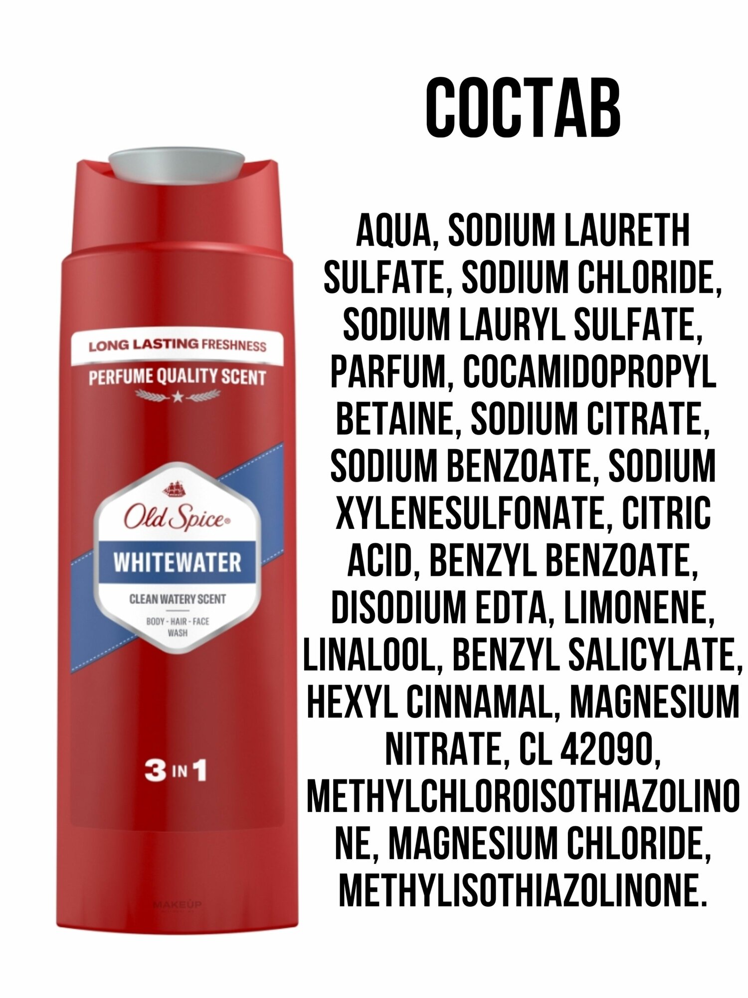 | Состав | aqua / sodium laureth sulfate / sodium chloride / sodium lauryl sulfate / Parfum / cocamidopropyl betaine / sodium citrate / Sodium Benzoate / sodium xylenesulfonate / Citric Acid / benzyl benzoate / disodium edta / Sodium Hydroxide / limonene / linalool / benzyl salicylate / Hexyl Cinnamal / magnesium nitrate / methylchloroisothiazolinone / magnesium chloride / methylisothiazolinone / ci 42090 dipropylene glycol / aqua / Propylene Glycol / Sodium Stearate / poloxamine 1307 / ppg-3 myristyl ether / Parfum / tetrasodium edta / limonene / linalool / Hexyl Cinnamal / Citronellol / Geraniol / benzyl salicylate / citral / alpha-Isomethyl ionone / eugenol / cinnamal / pentaerythrityl tetra-di-t-butyl hydroxyhydrocinnamate / ci 60725 / ci 61565 |