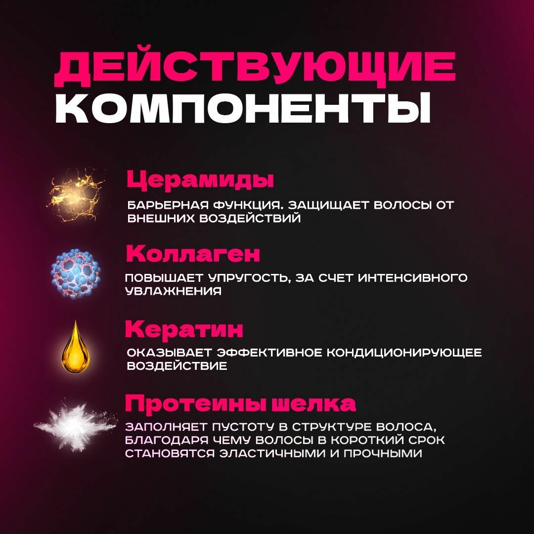 | Активный ингредиент | аргинин / витамин A / витамин B5 / витамин B6 / витамин C / витамин D / витамин E / витамин F / гиалуроновая кислота / гидролизованный шелк / глина / глицерин / глицин / керамиды / кератин / кокосовое молоко / коллаген / кукурузный крахмал / ментол / морские водоросли / пантенол / пептиды / протеины / протеины пшеницы / протеины шелка / салициловая кислота / цетримониум хлорид |