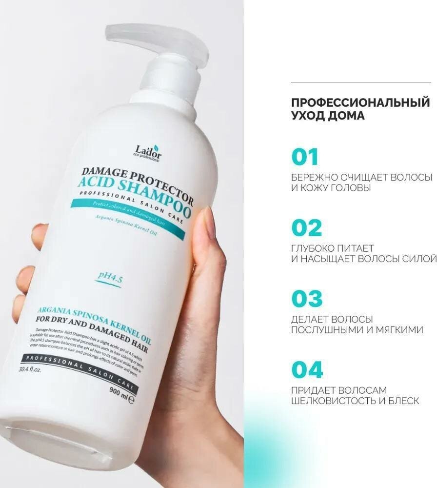 Бесщелочной шампунь с коллагеном и аргановым маслом La'dor Damage Protector Acid Shampoo 900 мл