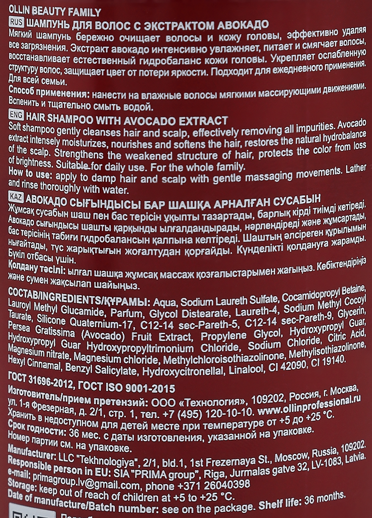 OLLIN BEAUTY FAMILY Шампунь для волос с экстрактом авокадо 500мл