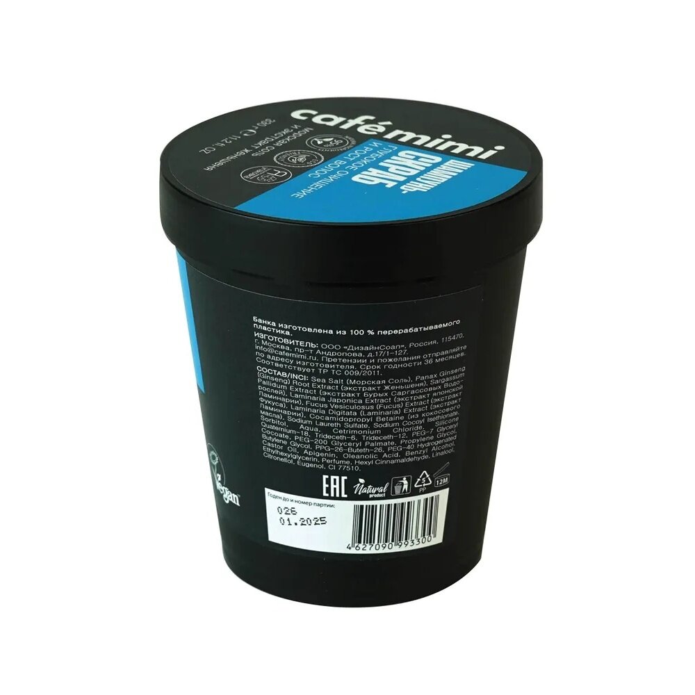 | Состав | Sea Salt (Морская Соль), Panax Ginseng (Ginseng) Root Extract (экстракт Женьшеня), Sargassum Pallidum Extract (экстракт Бурых Саргассовых Водорослей), Laminaria Japonica Extract (экстракт японской ламинарии), Fucus Vesiculosus (Fucus) Extract (экстракт Фукуса), Laminaria Digitata (Laminaria) Extract (экстракт Ламинарии), Cocamidopropyl Betaine (из кокосового масла), Sodium Laureth Sulfate, Sodium Cocoyl Isethionate, Sorbitol, Aqua, Cetrimonium Chloride, Silicone Quaternium-18, Trideceth-6, Trideceth-12, PEG-7 Glyceryl Cocoate, PEG-200 Glyceryl Palmate, Propylene Glycol, Butylene Glycol, PPG-26-Buteth-26, PEG-40 Hydrogenated Castor Oil, Apigenin, Oleanolic Acid, Biotinoyl Tripeptide-1, Benzyl Alcohol, Ethylhexylglycerin, Perfume, CI 77510 |