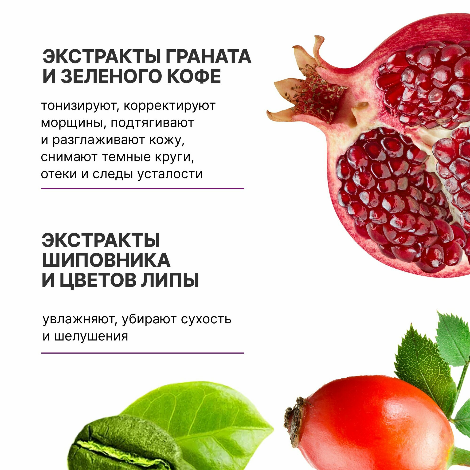 | Дополнительная информация | экстракты зелёного кофе и граната, экстракты шиповника и цветов липы, экстракт пиона, клевера |